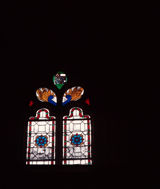 Croisillon occidental nord, fenêtre du mur est (8) : détail du remplage et des armoiriesImmatriculation