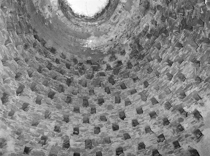 Intérieur du colombier, vue sur laquelle apparaissent les boulins et la coupole à oculus. Etat en 1977.Immatriculation