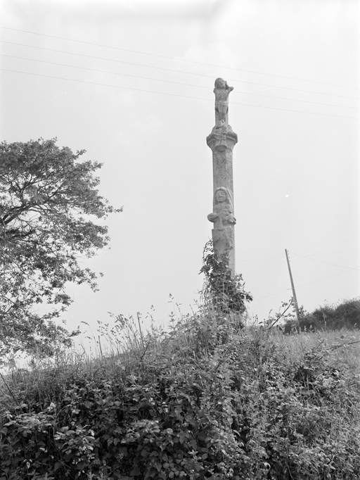 Vue générale de la face sud-ouest. Le socle, issu d'un réemploi, porte la date de 1860 qui ne correspond pas aux sculptures (de haut en bas : Christ en croix, Vierge à l'Enfant, Piéta, Memento Mori) certainement élaborées au 17e siècle. Croisillon brisé. Etat en 1977.Immatriculation