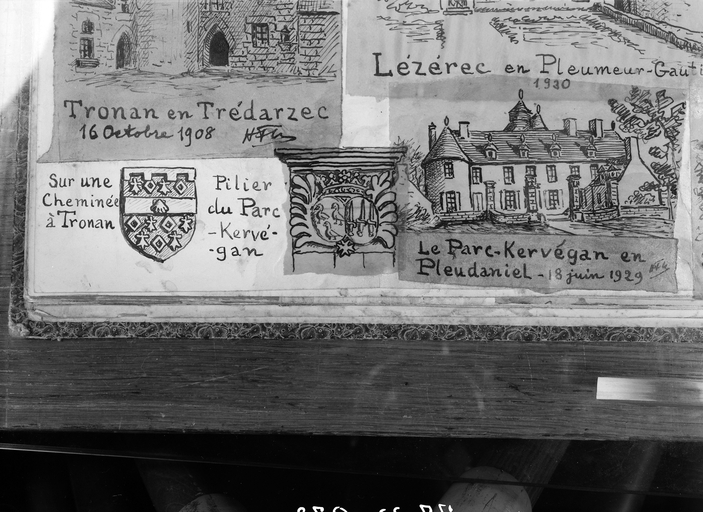 Elévation sud du manoir du Parc et détail des armes en alliance des Hingant et Loz présents sur les piliers d'entrée (dessin de H. Frotier de la Messelière, 1929)Immatriculation