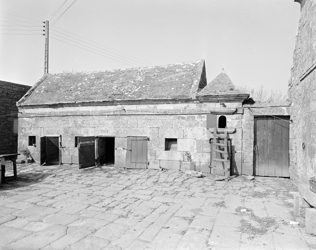 Crèches à cochons datées 1861, poulailler-pigeonnier et portail menant au jardin, vue prise de l'est. (1977)Immatriculation