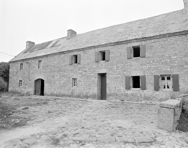 Ferme 3, élévation antérieure de l'alignement principal : logis daté 1832 et grange à porte charretière. (1977)Immatriculation