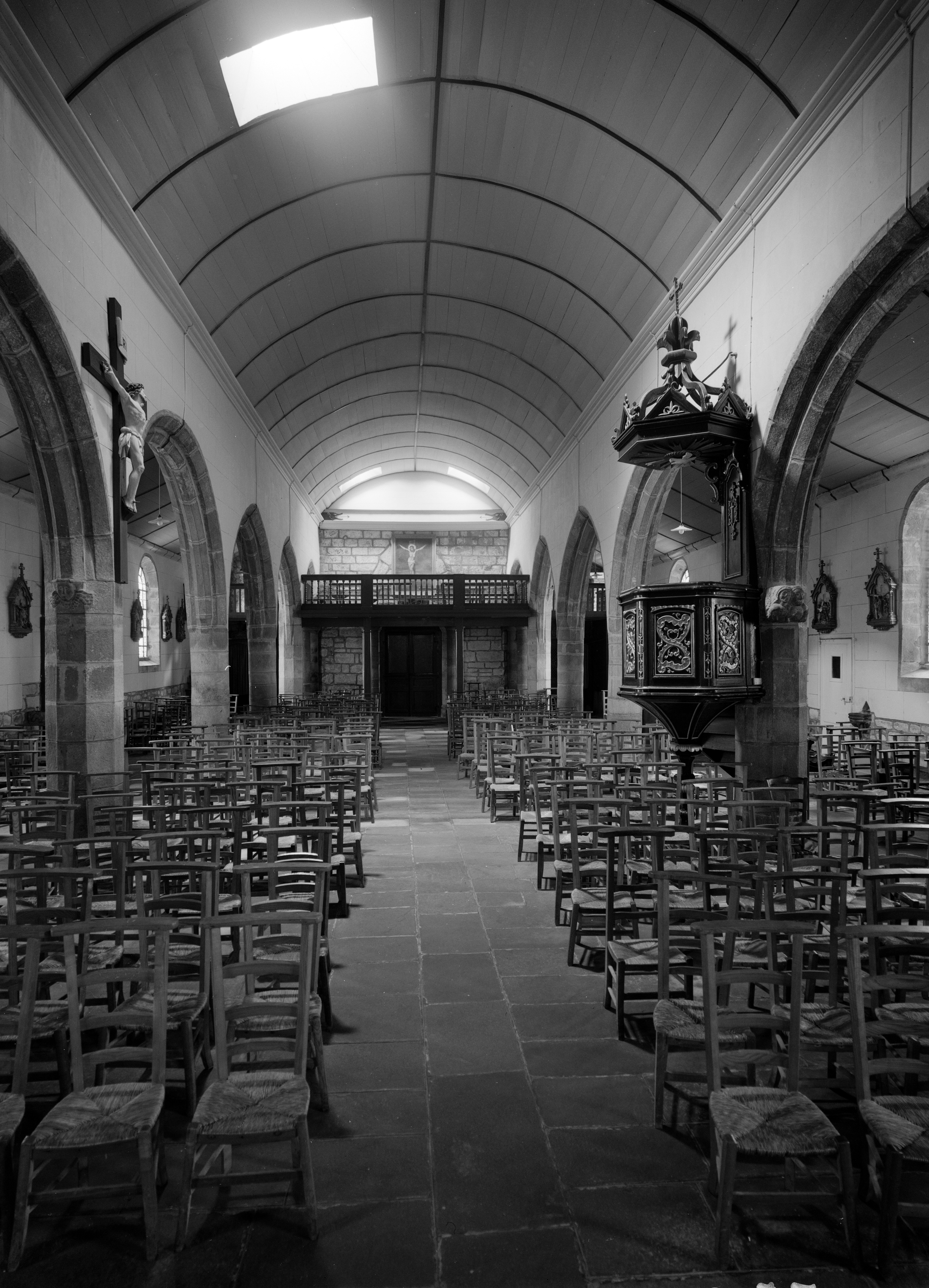 Vue intérieure de la nef vers l'ouest. (1977)Immatriculation
