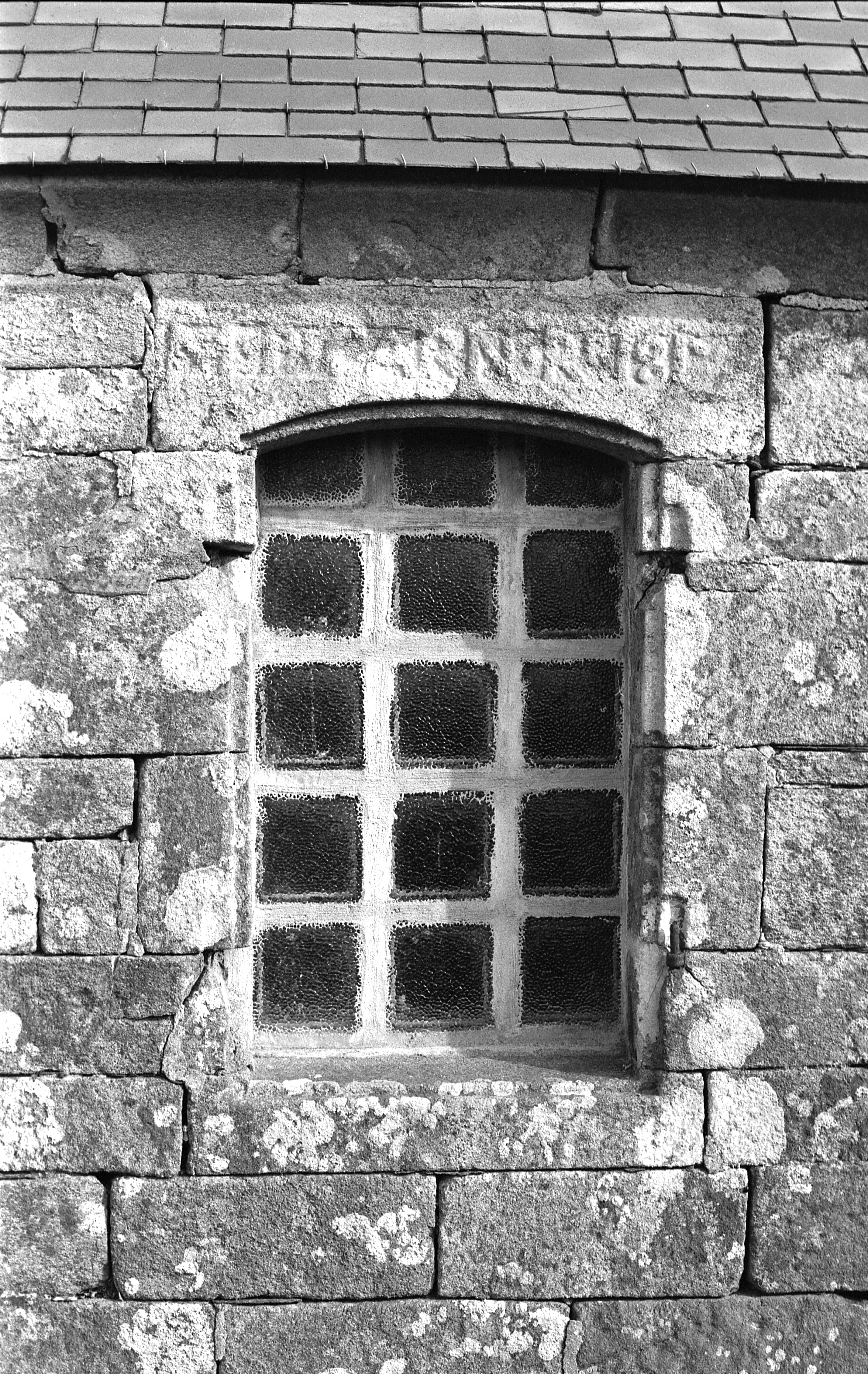 Façade sud, détail de la fenêtre et inscription : M.P.CARN.Rr 1817. (1977)Immatriculation