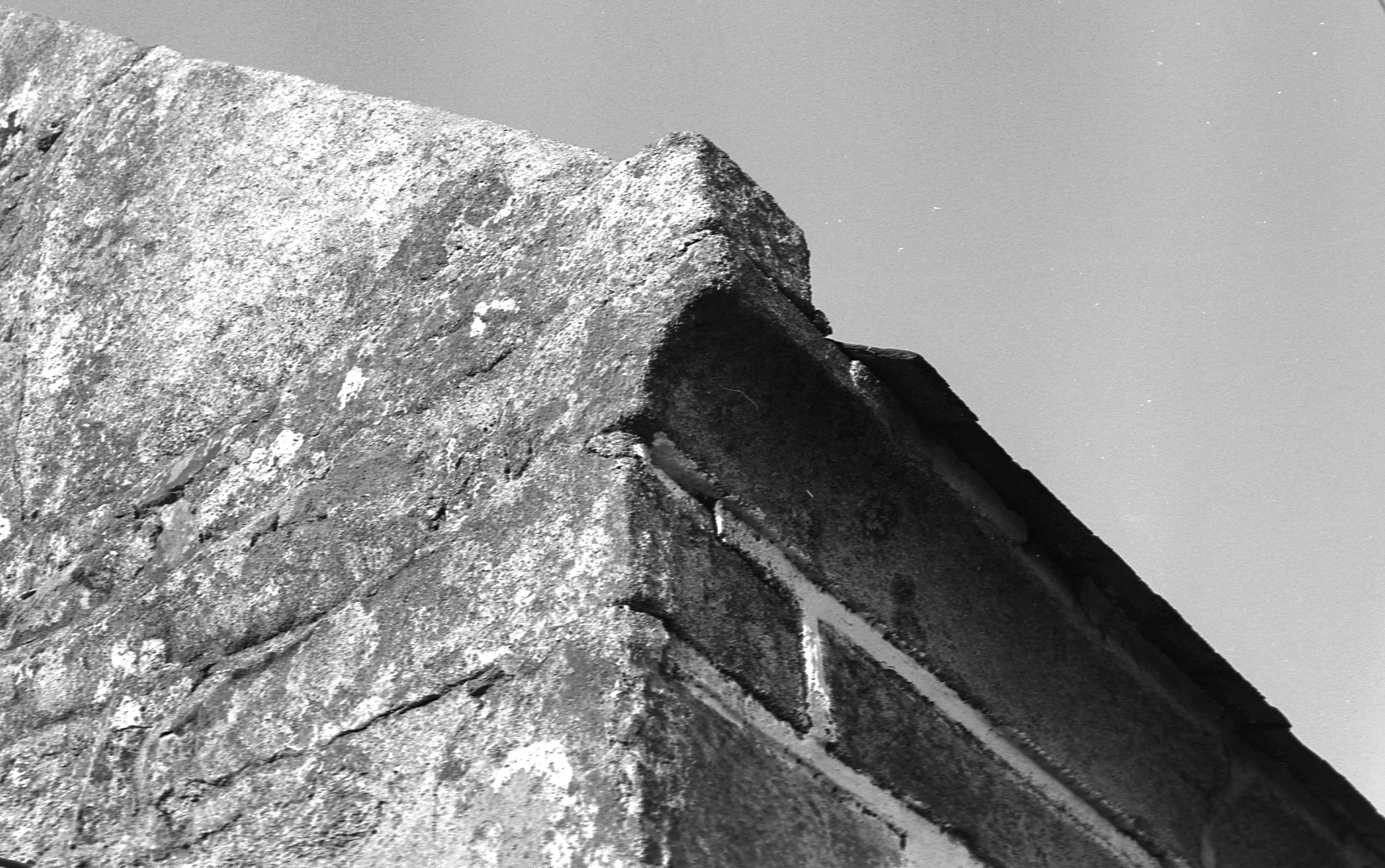Elévation antérieure du logis daté 1821, détail de la corniche du toit moulurée. (1977)Immatriculation