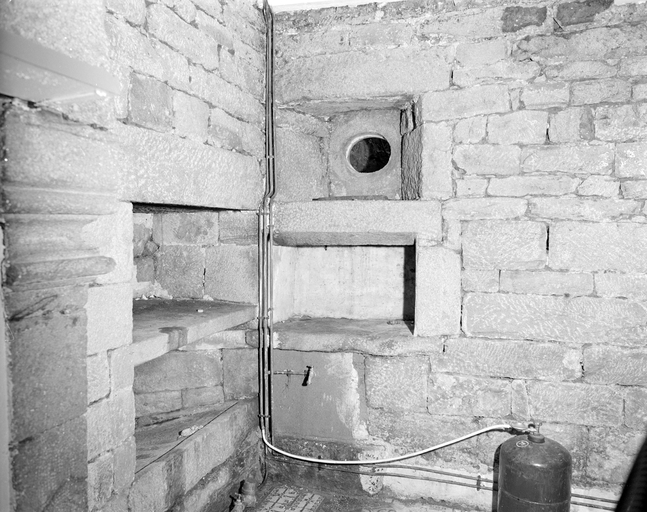 Logis daté 1661, rez-de-chaussée, murs ouest et nord, évier et oculus. (1977)Immatriculation