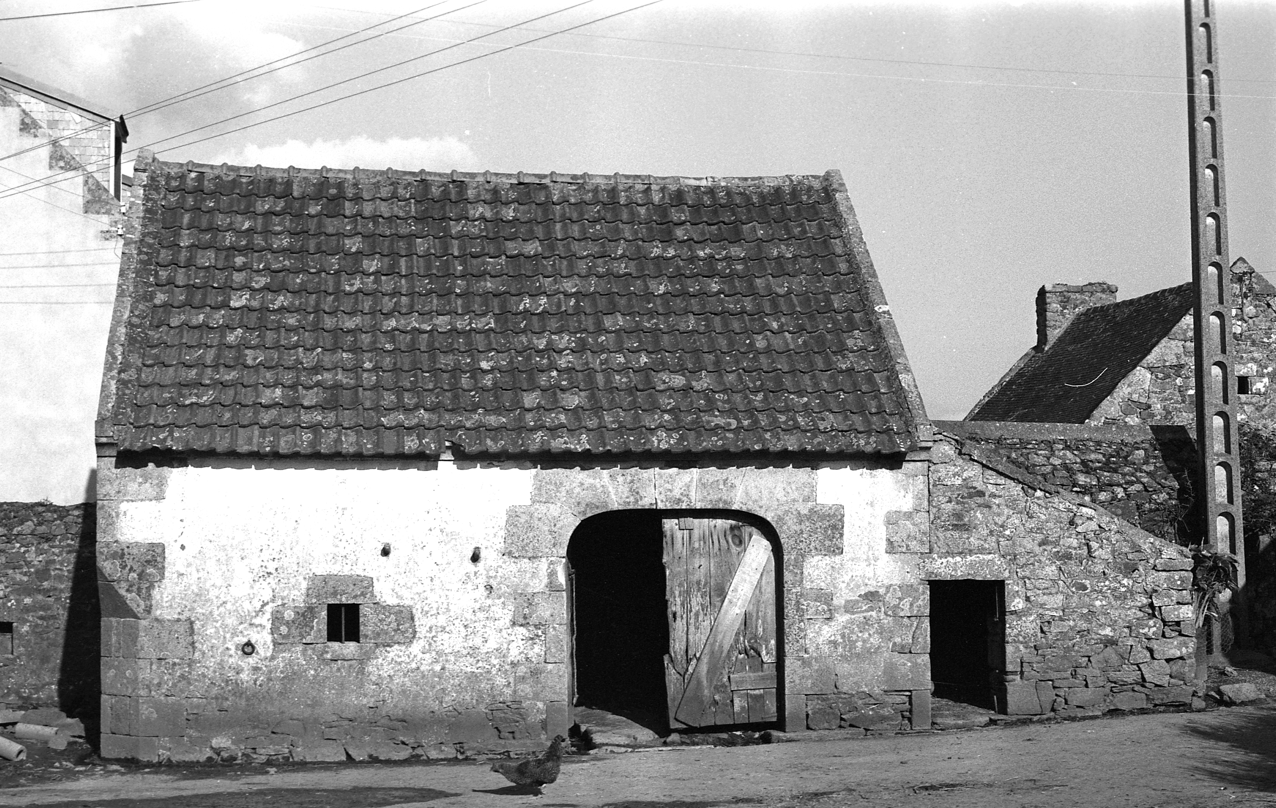Ferme 4, grange à porte charretière formant clôture à l'est de la cour, élévation ouest. (ouverture en arc segmentaire) (1977)Immatriculation