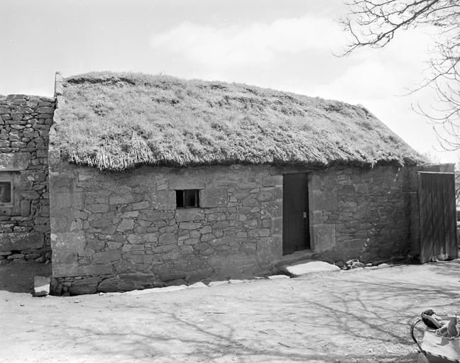 Etable avec toit en chaume aujourd'hui disparue, façade ouest. (1977)Immatriculation