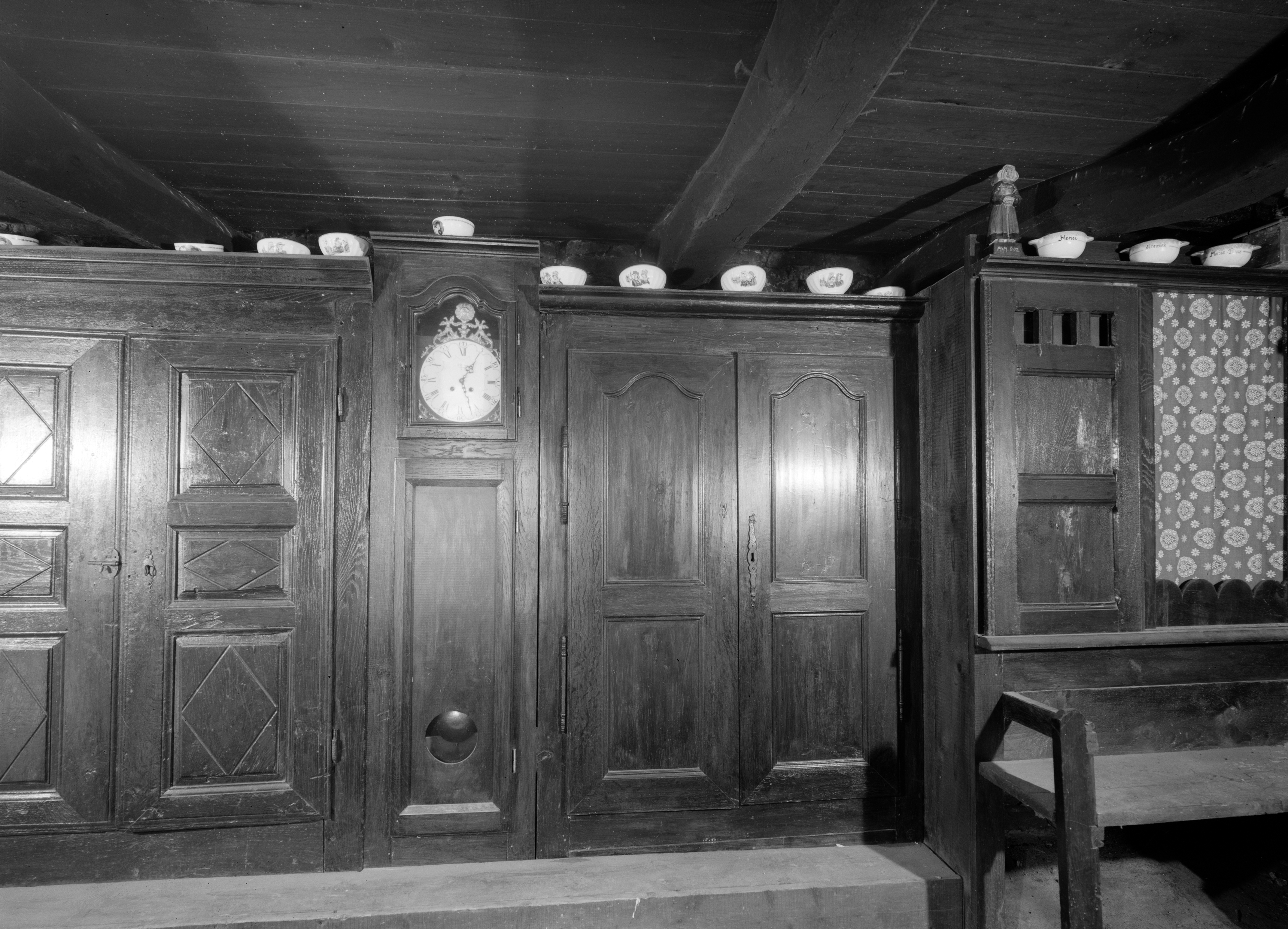Mur nord, front des armoires 1 : armoires, horloge, lit-clos près du feu, "bank koste'n ti" et rangée de bols sur les corniches. (1977)Immatriculation