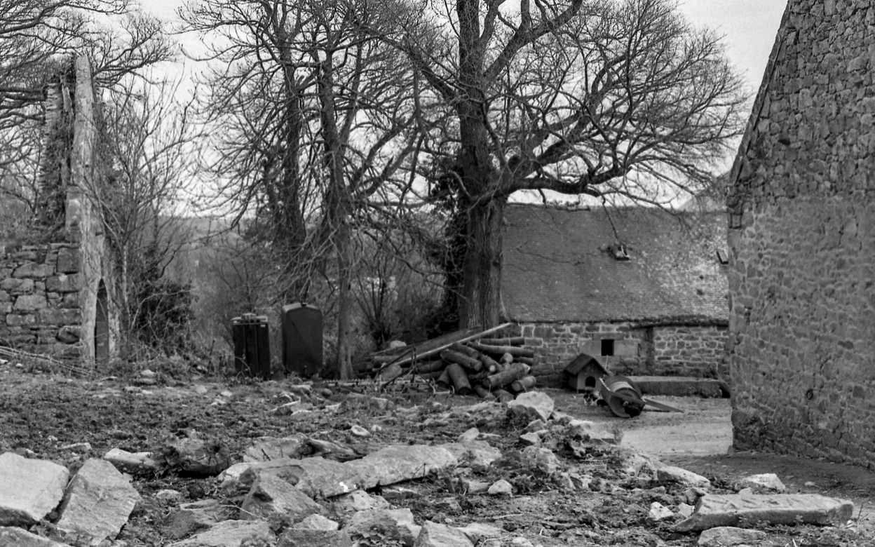 Côté est de la cour et bâtiments, vue prise du nord. Grange en ruines à l'est, fournil au sud et étable à l'ouest. (1977)Immatriculation
