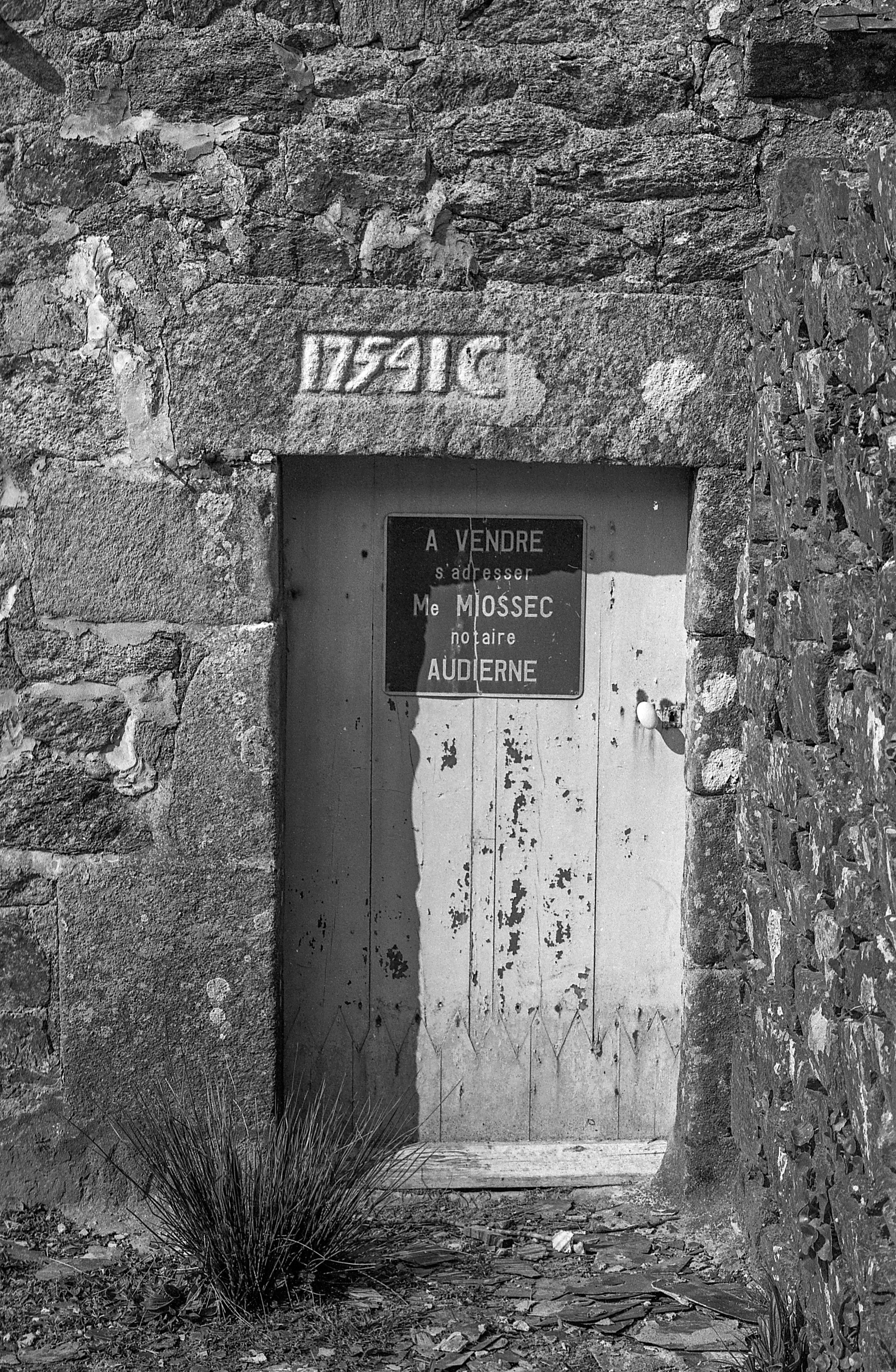 Elévation antérieure, porte d'entrée et inscription "1754 IC" rehaussée à la chaux. (1977)Immatriculation