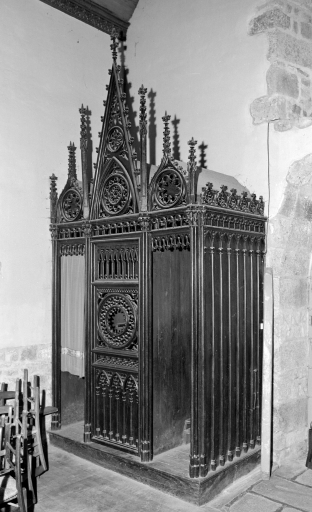 Ensemble de mobilier néogothique : autel, retable de la Vierge ; clôture, confessionnal, baldaquin des fonts baptismaux, fonts baptismaux, tableau : Baptême du christ (Chauvigné),