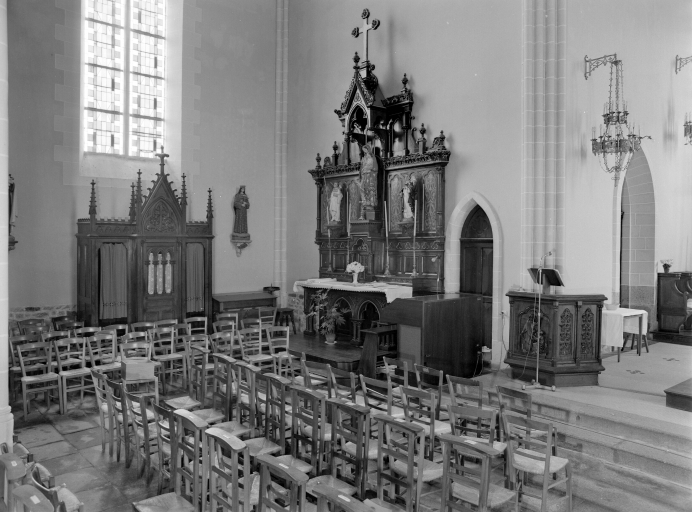 Ensemble de mobilier néo-gothique : maître-autel, autel de Saint-Joseph, autel de la Vierge et leur retable, chaire à prêcher, 2 confessionnaux (Marcillé-Raoul),
