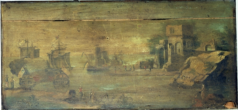 Imposte de la porte à droite de la cheminée, peinture : 'combat naval'Immatriculation