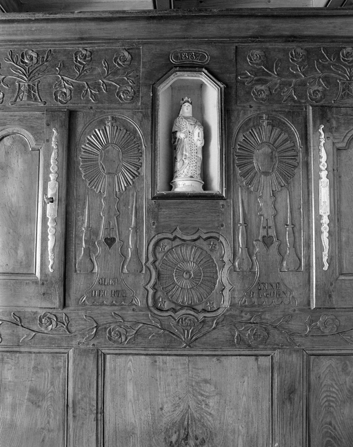 Drustuilh 5 daté 1887, détail de la Niche à Vierge et ostensoirs avec les noms des propriétaires gravés. (1978)Immatriculation