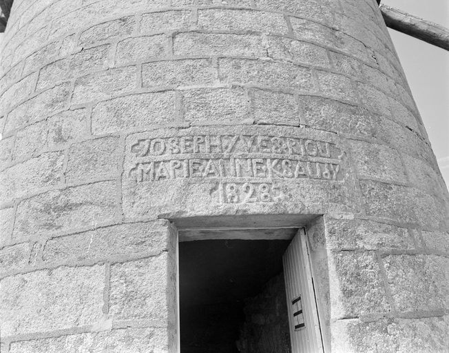 Porte sud et détail de l'inscription : " JOSEPH YVES RIOU MARIE ANNE K(er)SAUDY 1828". (1978)Immatriculation
