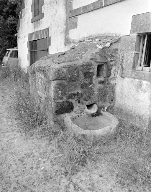 Logis daté 1877. Puits adossé à la façade. Vue de l'extérieur avec canal d'écoulement et auge monolithe. (1978)Immatriculation