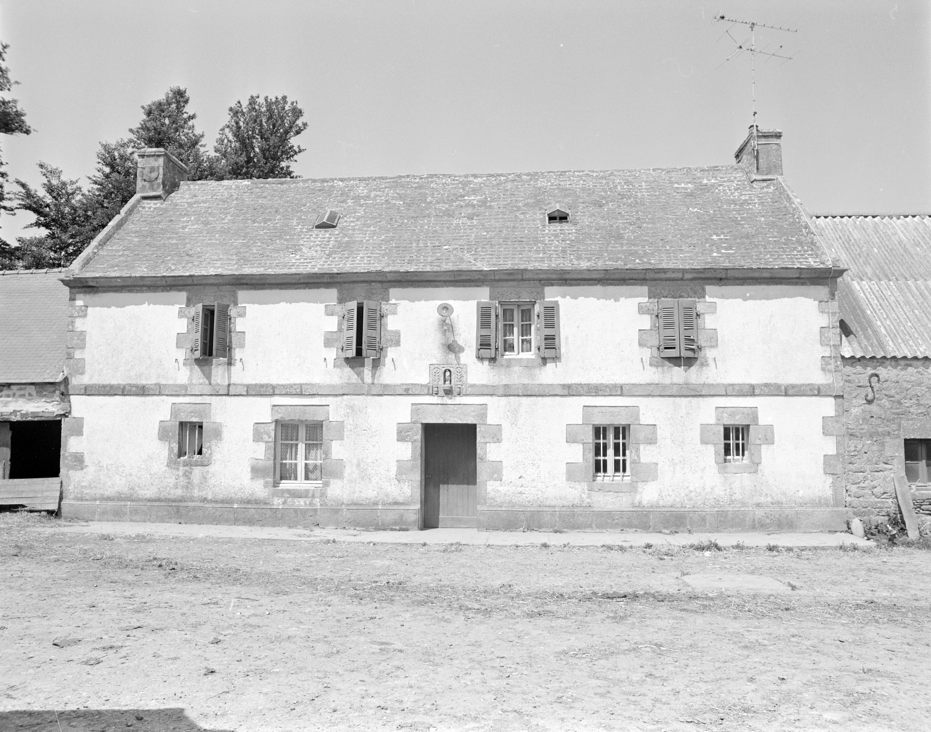 Loval, ferme 1, élévation antérieure du logis daté 1858. Niche à saint et cadran solaire. Façade antérieure crépie. (1978)Immatriculation