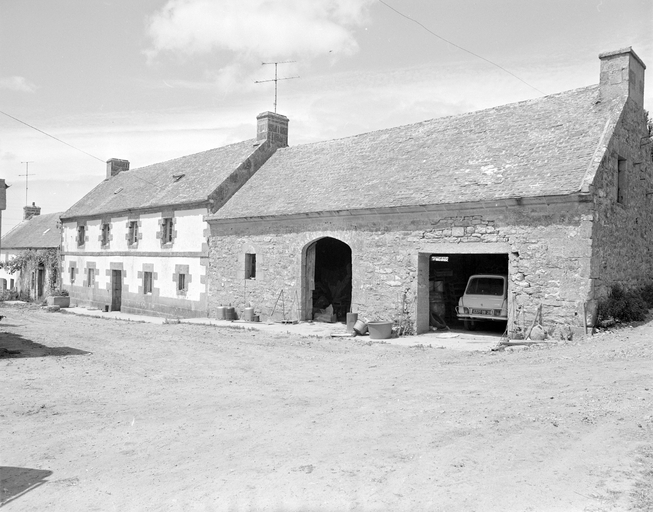 Élévation antérieure de l'alignement principal : logis daté 1843 et grange à porte charretière datée 1873. (1978)Immatriculation