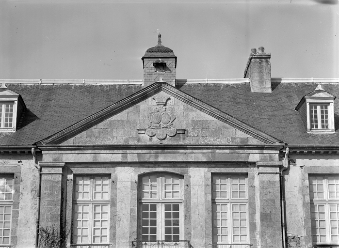 Elévation antérieure, fronton : vue de détailImmatriculation
