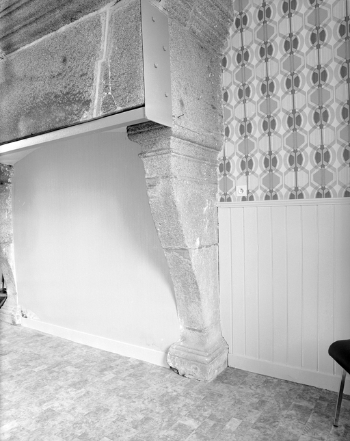 Vue de détail d'un piedroit de la cheminée du rez-de-chaussée.Immatriculation