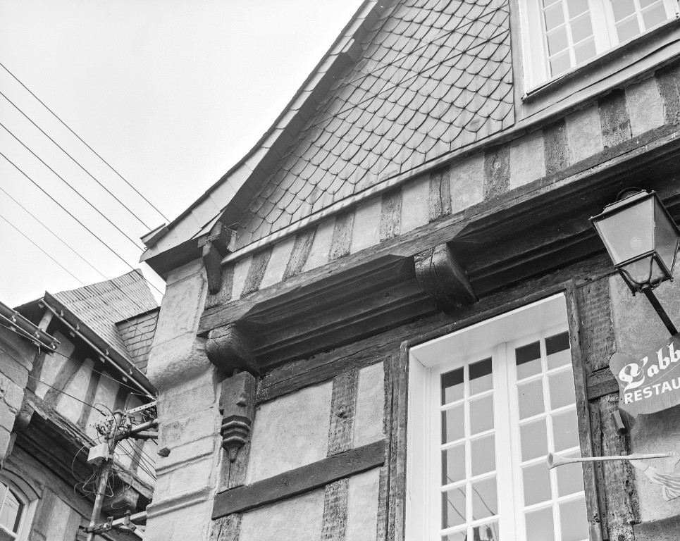 Elévation antérieure, détail de l'encorbellement supérieurImmatriculation