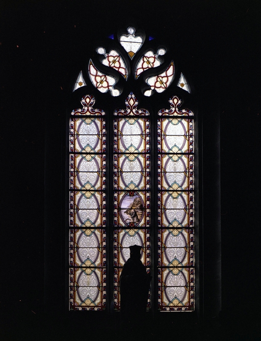 Verrière (9) : scènes des apparitions de la Vierge à Lourdes, verrière à personnages, chapelle Notre-Dame-de-Lourdes (Auray),
