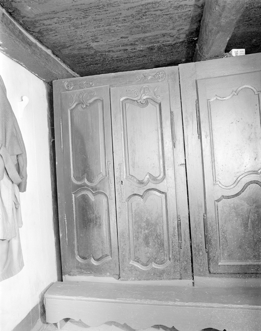 Mur nord, front des armoires : détail d'une armoire et "bank kosten ti". (1979)Immatriculation