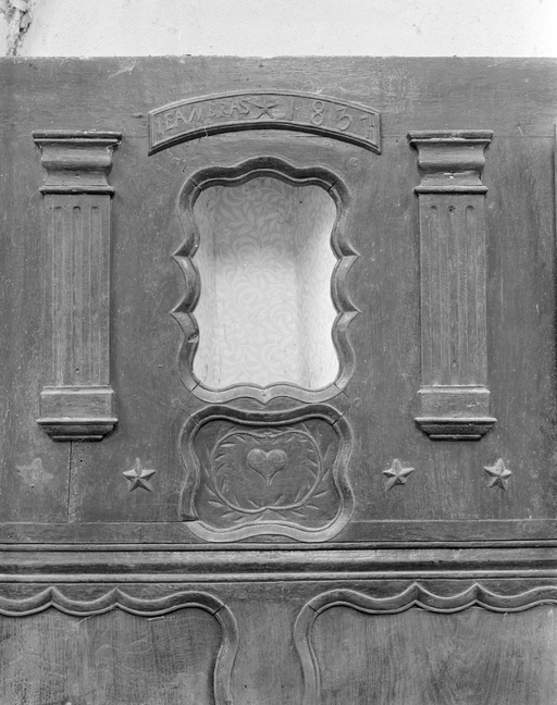 Drustuilh 7 daté 1831, détail de la niche à Vierge et inscription : IEAN BRAS 1831.Immatriculation