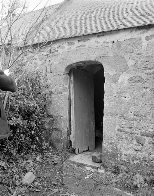 Elévation antérieure du logis, détail de la porte en anse de panier. (1979)Immatriculation