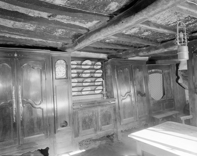Salle commune 2, vue générale vers l'est. Détail du front des armoires : armoires, horloge, buffet-vaisselier et lit-clos près du feu avec son banc).Immatriculation