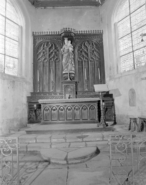Autel, retable, tabernacle, gradins d'autel (2), (maître-autel, autel tombeau, retable à panneau plat), style néo-gothique, chapelle Notre-Dame (Plonéis),