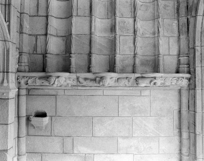 Porche sud, mur intérieur est, détail du soubassement mouluré. (1979)Immatriculation