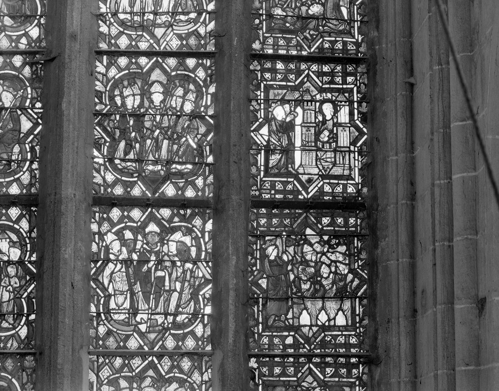 Verrière de la baie 100 (verrière légendaire) : Jugement dernier, Vie du Christ, Histoire d'Abraham, Vie de sainte Catherine, Vie de sainte Marguerite, évocation des évêques de Dol,