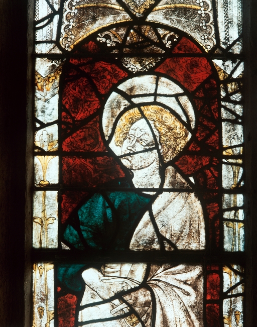 Verrière 0, panneaux d3, détail saint Jean.Immatriculation