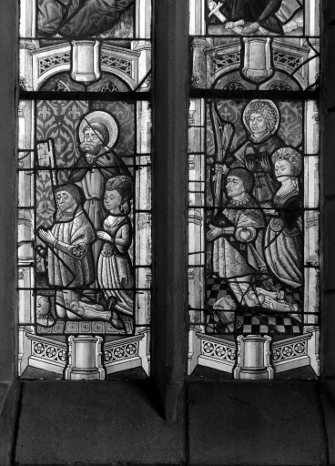 Panneaux 1e, 1f : couple de donateurs et saint Pierre, couple de donateurs et saint SébastienImmatriculation