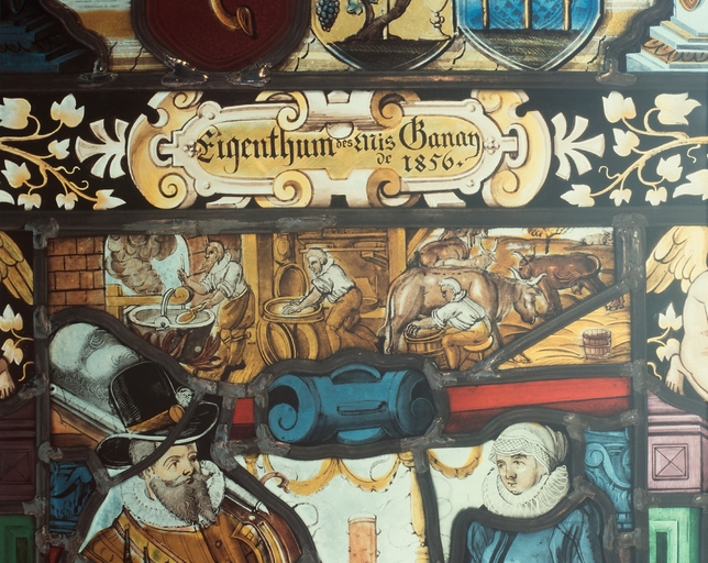 Lanvellec, Rosanbo : château, panneau B, partie inférieure, détail, fabrication fromage (après restauration)Immatriculation