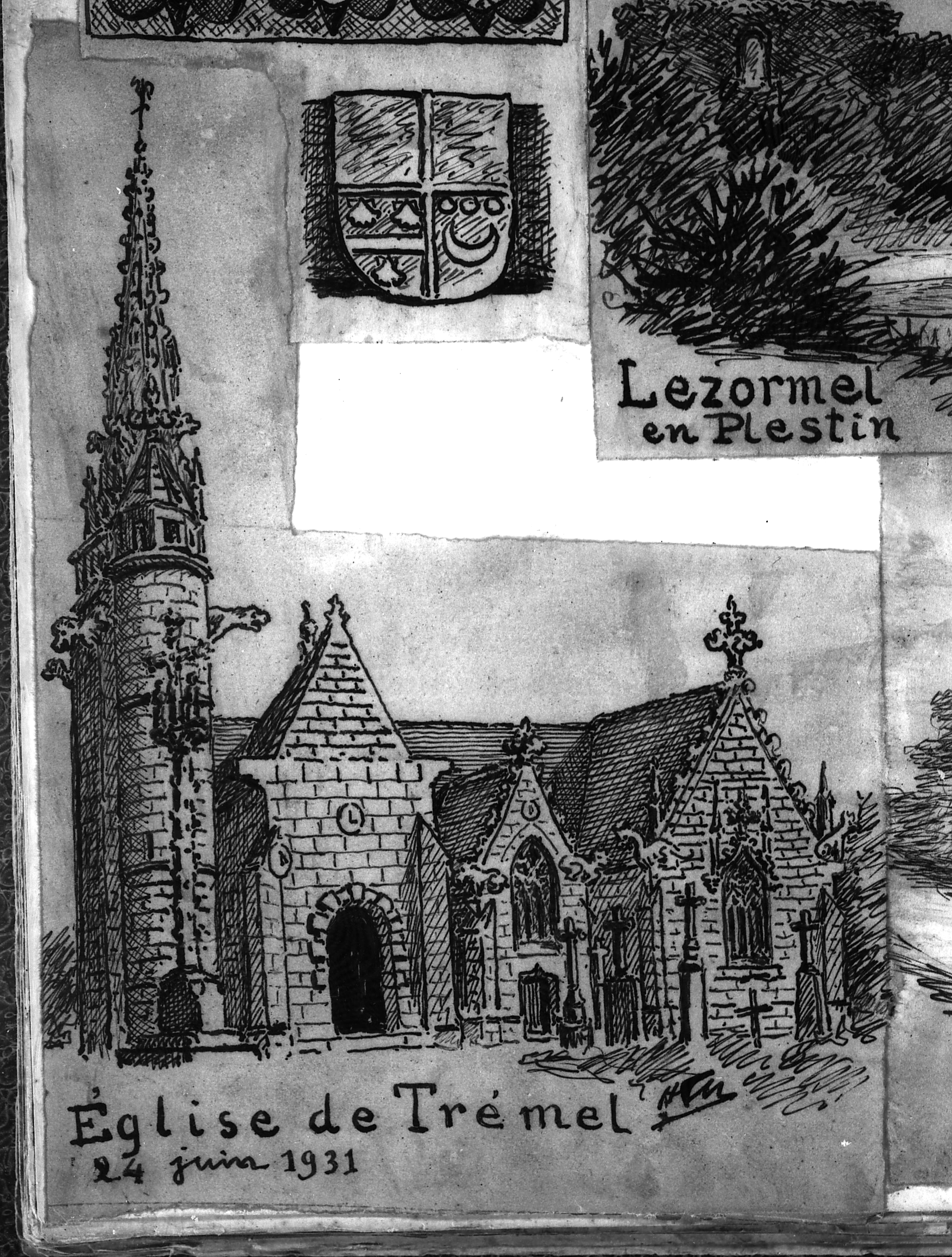 Trémel : église paroissiale Notre-Dame, vue générale depuis le sud-sud-ouest, croquis par Henri Frotier de la Messelière, 24 juin 1931Immatriculation