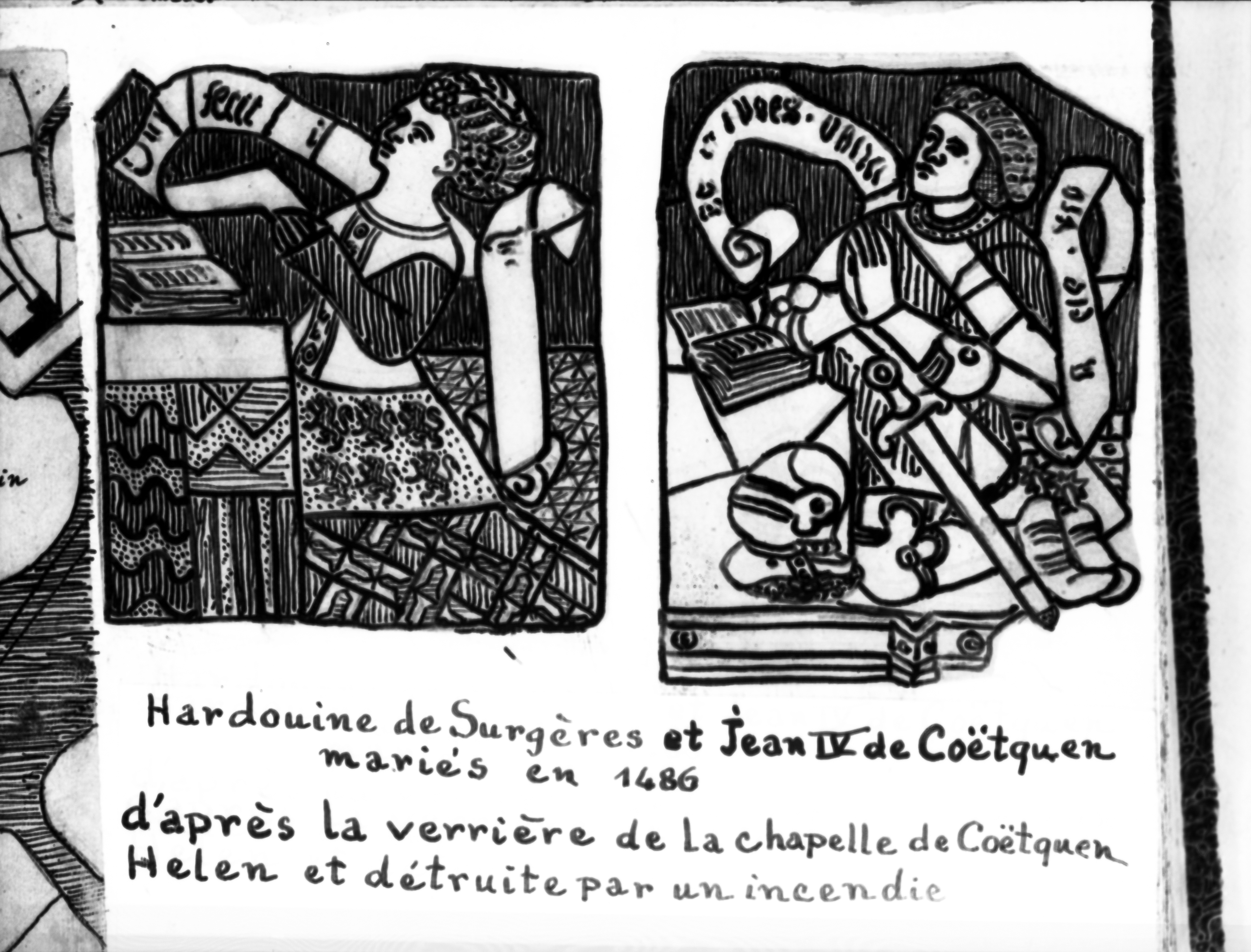 Portraits des seigneurs de Coëtquen par Henri frotier de la Messelière, Hardouine de Surgères et jean IV de Coëtquen mariés en 1486, d'après lma verrière de la chapelle de Coëtquen détruite par un incendieImmatriculation