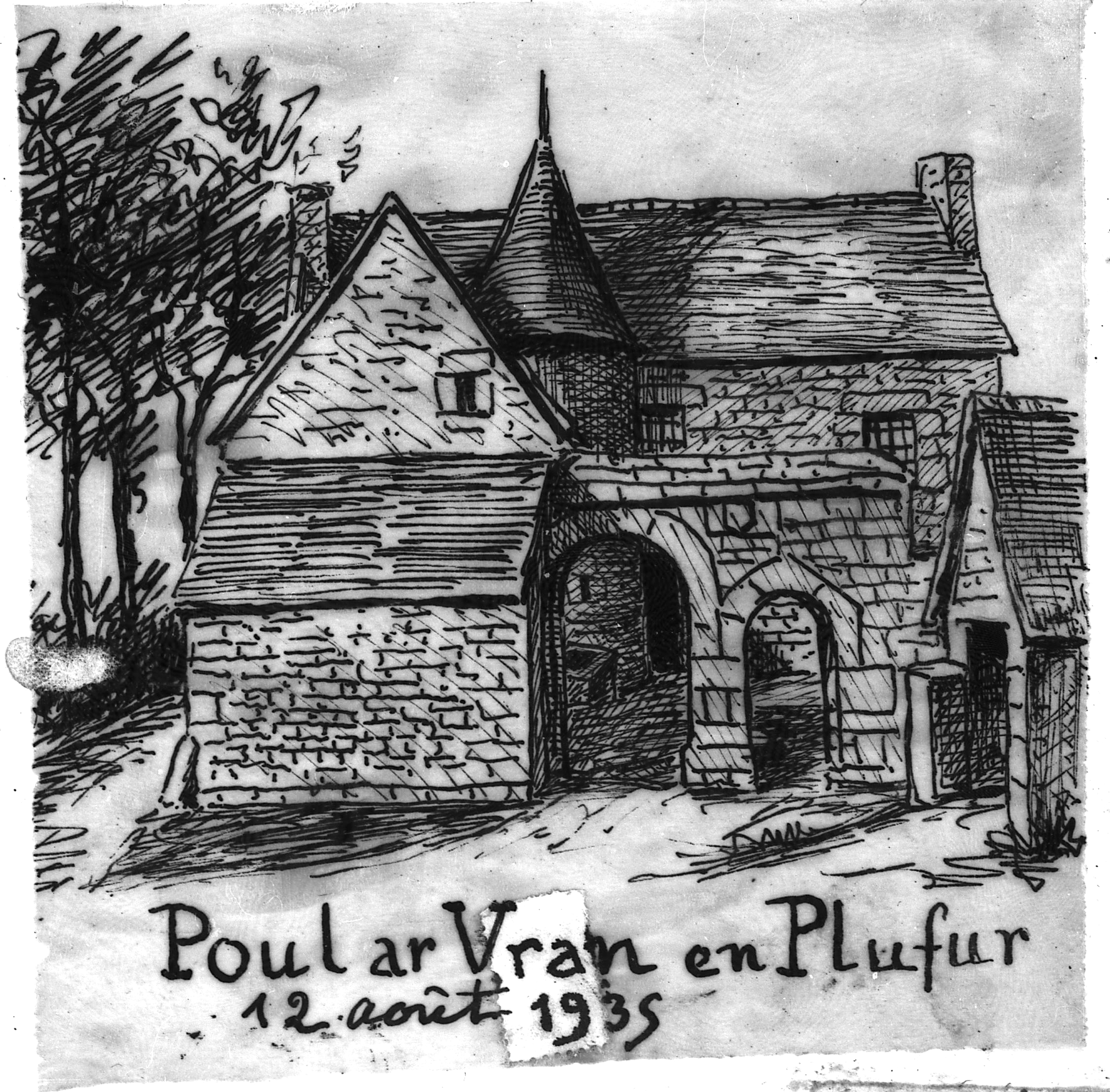 Plufur : manoir de Poul ar Vran, vue générale depuis l'est, entrées charretière et piétonne, croquis par Henri Frotier de la Messelière, 12 août 1935Immatriculation