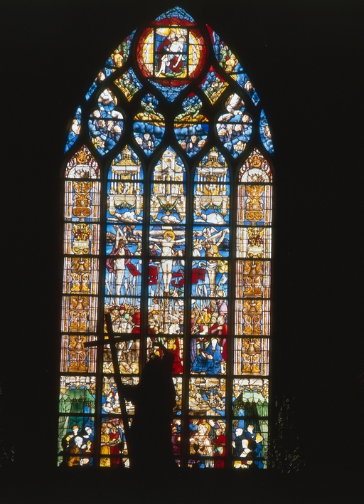 Verrière (maîtresse vitre) : Crucifiement (le), mort de Marie Madeleine, Trinité (baie 0), ancienne collégiale, actuellement église Sainte-Marie-Madeleine (Champeaux),