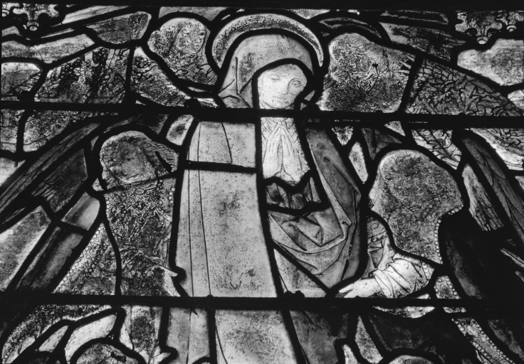 Verrière 1 : Vie de la Vierge, panneau b4, partie supérieure, vue de détail.Immatriculation