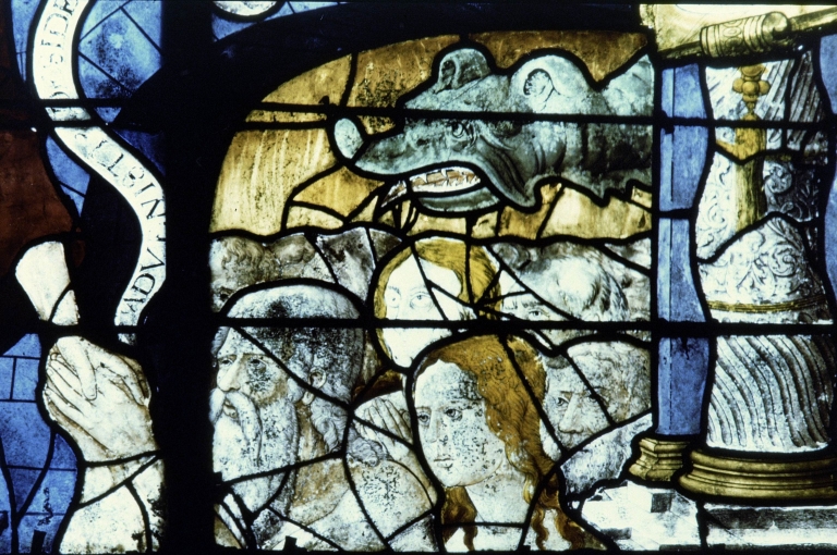 Verrière 3 : Descente aux limbes, groupe de personnages délivrés du démon, vue de détail.Immatriculation