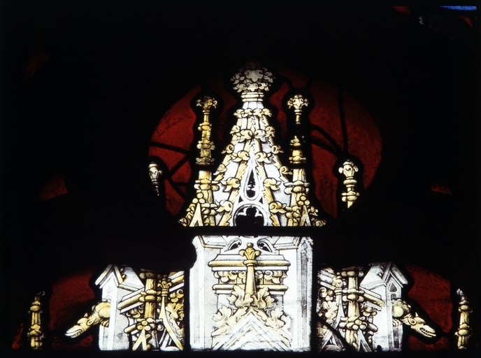 Verrière de la baie 5, panneau a5 : dais d'architecture, à gauche (état en 1980)Immatriculation