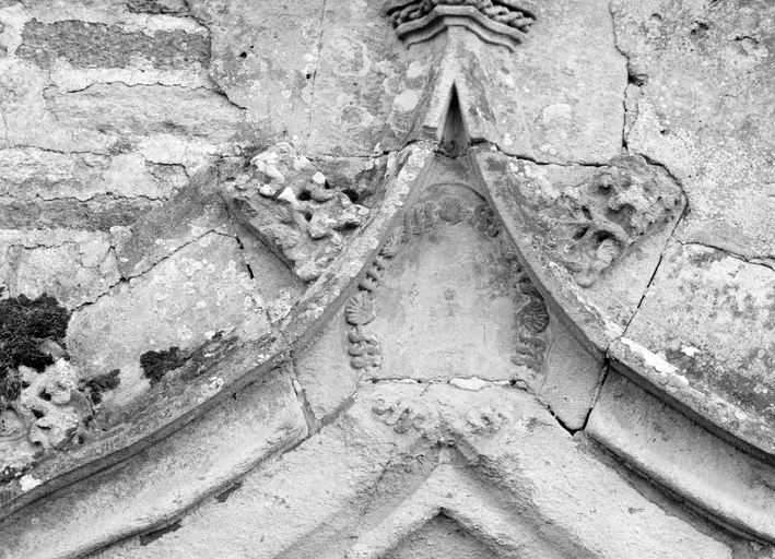 Elévation antérieure, porte : détail de l'écu au centre de l'archivolte.Immatriculation