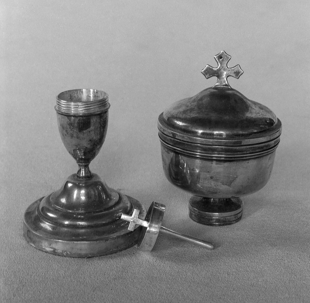Ciboire ; boîte à huile des malades, église Notre-Dame de la Tronchaye (Rochefort-en-Terre),