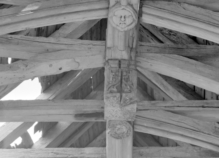 Charpente : bouts de poinçon pendants au-dessus du choeur : détail blason non identifié, soleil, lune.Immatriculation