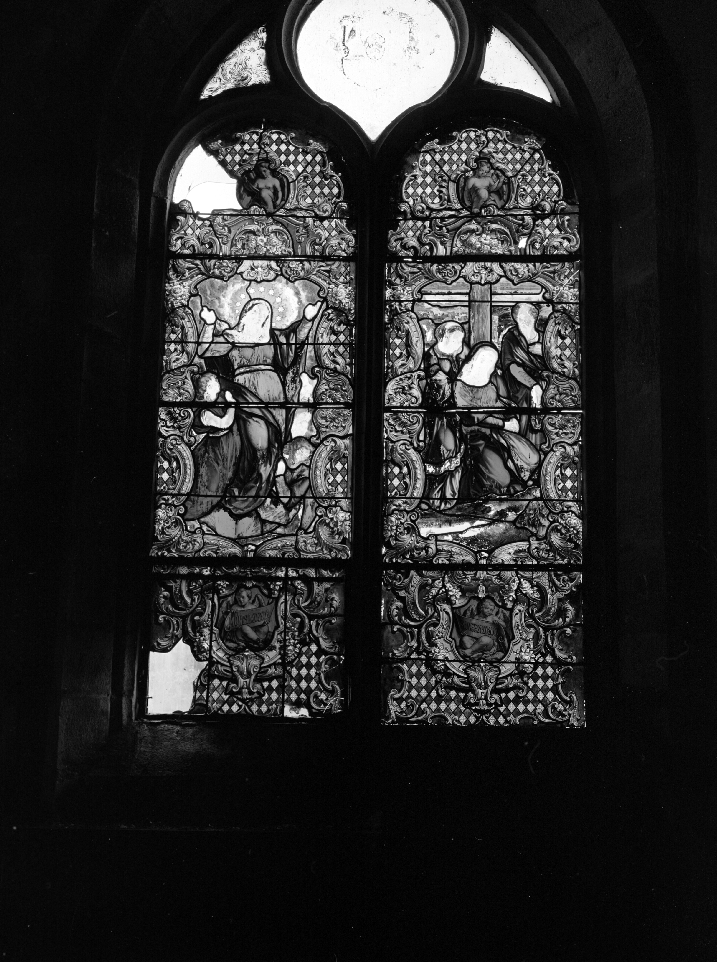 Chapelle, vitrail, la Compassion et l'Assomption de la Vierge.Immatriculation