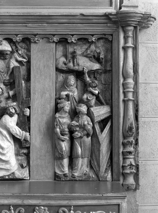 Autel et retable sud, panneau sculpté : femmes au tombeau.Immatriculation