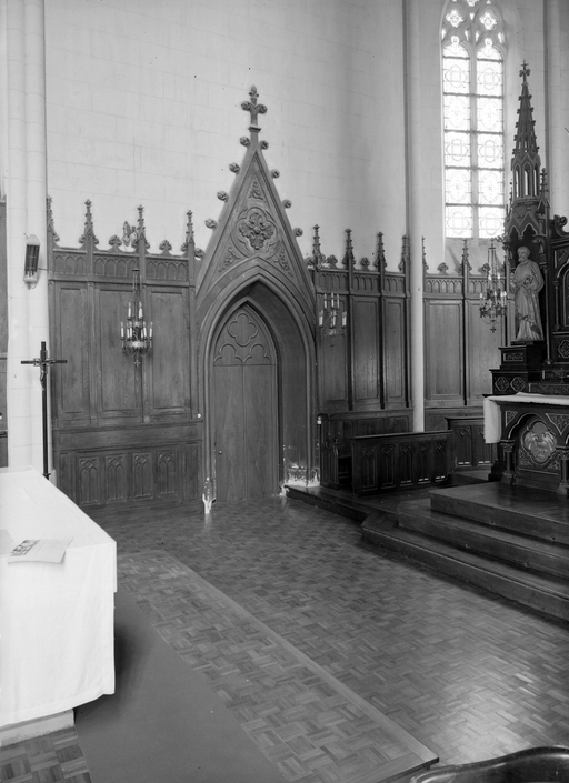 Autels (3), retables (3), confessionnaux (2), chaire à prêcher, lambris de hauteur, stalles, statues (8), groupe sculpté (maître-autel, autel secondaire), style néo-gothique, église paroissiale Saint-Martin (Le Sel-de-Bretagne),